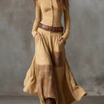 • Silhueta Escultural: O corpo ajustado com botões metálicos define a cintura e realça a feminilidade, enquanto a saia maxi ganha vida a cada passo.